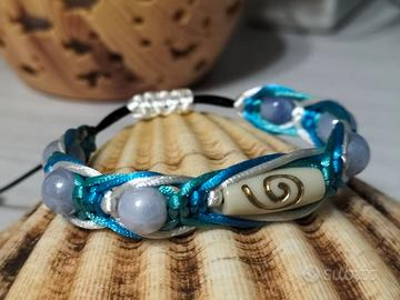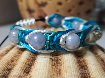 Bracciale Shamballa realizzato a mano con filo di poliestere bianco,azzurro e verde acqua marina.
