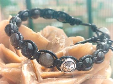 Bracciale Shamballa realizzato a mano con perline di ottima qualità di Ossidiana argentata da 8mm, inserimento di charm zincato colore silver con raffigurato il Tao.