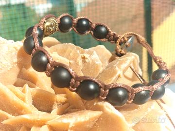 Bracciale Shamballa realizzato a mano in stile tibetano con perline in legno di Ebano nero da 8mm.