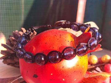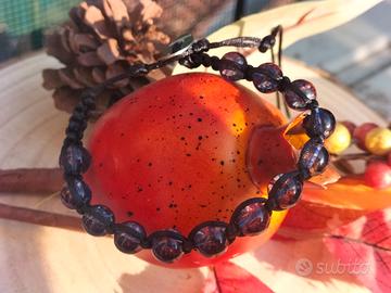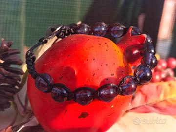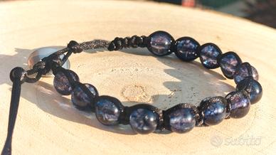 Bracciale Shamballa realizzato a mano con filo di giada nero da 1mm molto resistente. Perline naturali usate: Quarzo blu da 8mm con riflessi viola molto bella alla luce solare. Chiusura a bottone regolabile tramite asole già presenti sul cordoncino. Viene venduta con sacchettino di organza,ottima idea regalo.