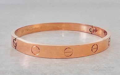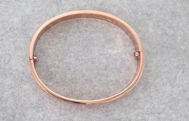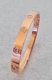 Bracciale stile Cartier modello Love, colore oro rosa, con iconiche viti incise. Chiusura a vite. Nota: si tratta di un’imitazione (non originale). Nuovo, mai indossato.