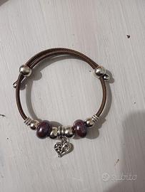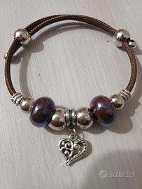 bracciale regolabile in filo di sughero mai usato con particolari in acciaio nichel free, charme cuore e pietre in ceramica color amaranto/mattone scuro