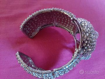 Bracciale teschio a fascia larga . Bigiotteria di alta qualita' in lega di bronzo e acciaio con pave' di cristalli strass. Anallergico inalterabile antiossidazione. Si indossa ottimamente con allargamento a molla. Misura 7 cm x 7.5 cm x 5.5 cm. Diametro interno 5.5 cm