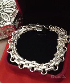 Vendo esclusivo bracciale UNISEX, caratterizzato da una struttura a maglie articolate e realizzato con una base di alta qualità e una raffinata finitura PLACCATO in ARGENTO925, il gioiello presenta un design a "binario" che alterna elementi cilindrici lucidi a snodi circolari, creando un gioco di riflessi dinamico e moderno.Materiale: Metallo testurizzato con tripla PLACCATURA in ARGENTO 925 (punzone del materiale di placcatura visibile sulla chiusura).Lunghezza: 20 cm.Chiusura: Moschettone sicuro e funzionale. Peso grammi 23,5. Mai usato. Invio in scatola con incluso utile panno lucidagioielli OMAGGIO !