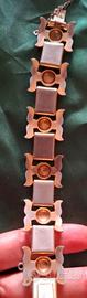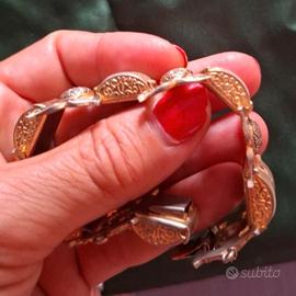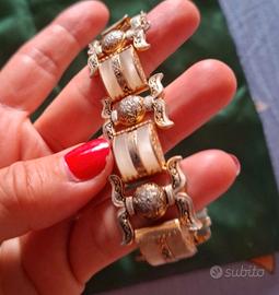 Raro bracciale retró damaschinato. La damaschinatura é un'antica tecnica artigianale di Toledo che consiste nell'incastonare fili sottili d'oro in solchi incisi su una superficie metallica, creando disegni ornamentali. Sono presenti intarsi color oro damasco con madreperla, effetto pietra di luna. Il bracciale si chiude con una chiusura a scatto e ha anche una chiusura di sicurezza.
