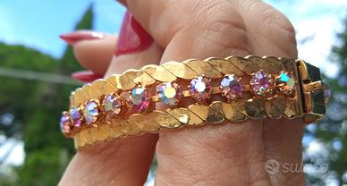 Bracciale, alta bigiotteria vintage, anni '60, con cristalli sfaccettati in Cristallo di Boemia, molti toni tra il rosa e il turchese, cerchio rigido, bagnato nell'oro (?) apribile con fermaglio.