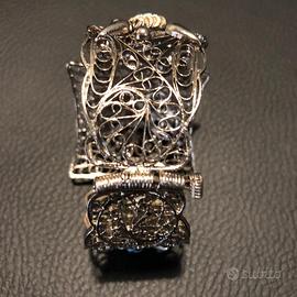 bracciale a pannelli in filigrana d'argento con cerniera e inserti in turchese, pezzo vintage anni '70. La lavorazione in filigrana è una tecnica antica che crea intricati motivi con sottili fili d'argento, caratteristica della tradizione egiziana.