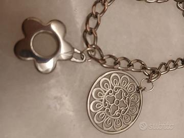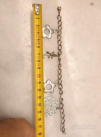 Bracciale con ciondoli primi anni 2000. In metallo argentato, composto da catena a maglie con elementi decorativi pendenti. Presenta un grande medaglione traforato con motivo floreale, due charm a fiore con foro centrale e un ciondolo a forma di geco, dettaglio tipico dello stile etnico e boho diffuso tra fine anni ‘90 e primi 2000.
