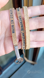 Bracciale firmato WE POSITIVE + vintage realizzato artigianalmente in vera pelle color argento con scritte fucsia motivazionali.