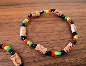 Braccialetti a destra (2 pezzi): stile afro con elastico, caratterizzati da perline colorate e inserti in simil legno intagliato. Perfetti per chi ama un look etnico e casual.