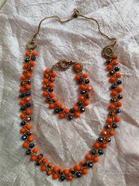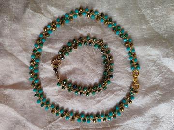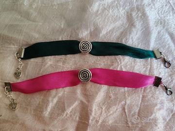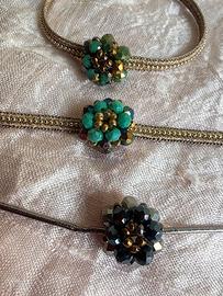 Creazioni realizzate come hobby con perline di vetro e minuteria. Prezzo 5 euro caduno: braccialetto in nastro di raso verde o rosa e spirale; braccialetto in filato bordeaux e perline bianco-grigio-viola. 6 euro: braccialetto con fiore in perline nero/argento e cordino metallico. Prezzo 7 euro caduno: braccialetto con fiore di perline turchese/bronzo. Prezzo 15 euro: set collana e braccialetto arancione-viola-blu. Prezzo 15 euro: set girocollo e braccialetto verde acqua-verde-bronzo.