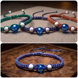 Braccialetti unici realizzati a mano, perfetti per aggiungere un tocco di colore al tuo stile. - Realizzati con cordino intrecciato. - Decorati con perla centrale metallizzata (blu, grigio scuro, fucsia) e perline in legno laterali. - Design regolabile per adattarsi a ogni polso. - Colore cordoncino a scelta.