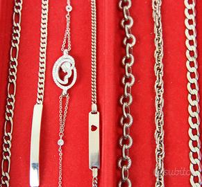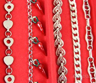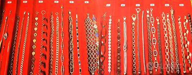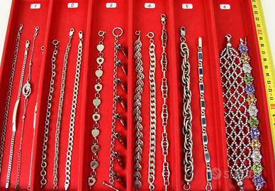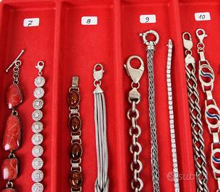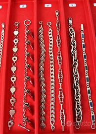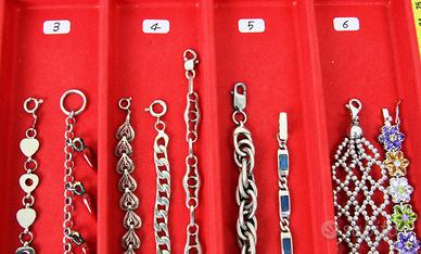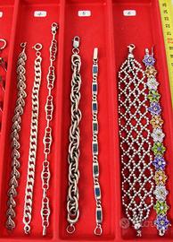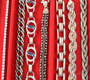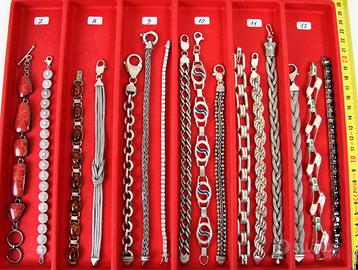 PR926 Originali braccialetti " Vintage " degli anni 50 /70 in argento 800/925. Tutta la collezione è composta di pezzi di vecchia manifattura con vari tipi di pietre e smalti policromi. Vari tipi di chiusure e tutti con marchiatura del titolo in argento massiccio. Italia Anni 50/70 Per focalizzare l'oggetto, facendo riferimento alla prima foto, si procede con l'identificazione del settore verticale partendo da sinistra verso destra (Ci sono 12 settori numerati, dal primo a sinistra al didicesimo a destra ) I braccialetti che sono contenuti in ogni settore hanno lo stesso prezzo. E' gradita anche una breve descrizione dell'oggetto, come prova di conferma che lo abbiamo centrato esattamente. Il prezzo ( che va dai 20 ai 140 Euro ) si riferisce ad un unico braccialetto a seconda della scelta nel settore previsto. PREZZI: Settore 1 (il primo) € 20 Settore 2 (il secondo) € 30 3 € 40 4 € 50 5 € 60 6 € 70 7 € 80 8 € 90 9 € 100 10 € 120 11 € 130 12 € 140 Spedizione assicurata e/o raccomandata tracciabile con costo da concordare. Per cortesia contattatemi solo se realmente intenzionati. Questo é un negozio on-line a prezzi fissi. Sono a disposizione al