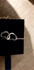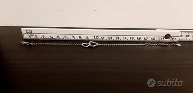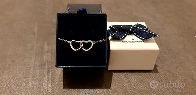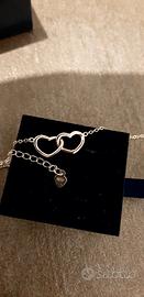 Bellissimo braccialetto con ciondolo a forma di due cuori intrecciati. Braccialetto in argento rodiato 925% e zirconi bianchi.