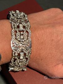 Bellissimo braccialetto in argento 925 semi rigido. Tempestato di cristalli Swarovski bianchi a taglio brillante e navetta. Chiusura a pressione con doppia chiusura di sicurezza a otto. Peso gr 52,93. Per altre informazioni e dettagli scrivetemi. Uso teatrale o per amatori del lusso!