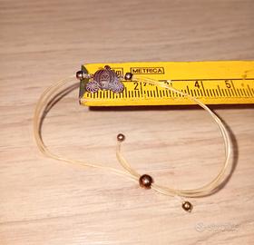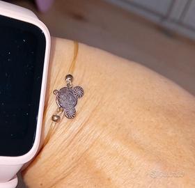 Braccialetto in argento placcato oro rosa (da lucidare) con mini charm a forma di Carrozza di Cenerentola marca Rue des Mille (logo sul retro).Montato su filo trasparente elasticizzato e palline per regolare la chiusura sempre in argento (no loghi).Ha molti anni per cui il filo si è ingiallito e tutti i componenti sono da lucidare con prodotti adeguati.Non ha il timbro argento ma questa marca produce solo in argento.