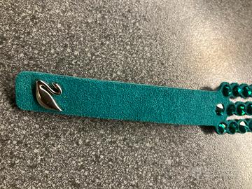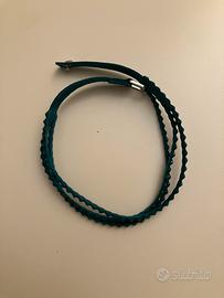 3 file di cristalli verde scuro e camoscio sintetico dello stesso colore utilizzabile come braccialetto o collana girocollo, chiusura regolabile, come nuovo. Misure xm 40x2 (LxH).