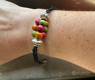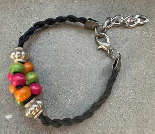 Braccialetto con sferette in legno multocolori, distanziali argentati e corda intrecciata. Misura minima 16 cm. Misura massima 20 cm.