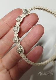 Vendo braccialetto regolabile in filo di cotone di colore bianco sporco con cinque palline al centro decorate con cristalli Swarovski.