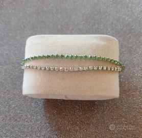 Elegante e raffinato, questo braccialetto da donna è un gioiello di bigiotteria perfetto per aggiungere un tocco di luce ad ogni outfit. Caratterizzato da un doppio filo di piccoli brillantini argentati e verdi, si distingue per la sua delicatezza e la capacità di catturare la luce ad ogni movimento. Nuovo e mai indossato, è l’accessorio ideale per chi ama brillare con discrezione ed eleganza.
