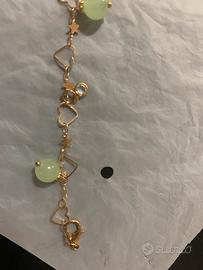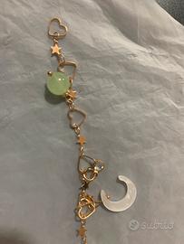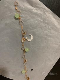 Braccialetto elegante con charm a forma di cuore, stella e luna, decorato con piccole pietre verdi.