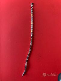 Bracciale in acciaio, tre colori e picccole pietre. Lunghezza cm 18, escluso la chiusura.