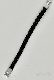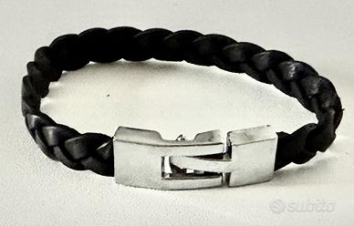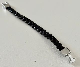 Braccialetto in cuoio scuro intrecciato con chiusura in acciaio lucido Lunghezza cm 20,8