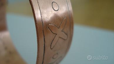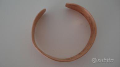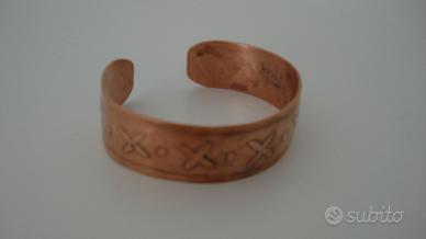 vendo braccialetto a fascia in rame di fattura artigianale, anni 70-80, interno martellato, peso ca. 30gr., diam. max 6,5 cm, altezza fascia 2 cm. Lucidato, alcuni punti portano ancora i segni del tempo. Ha bisogno di una lucidatura finale.