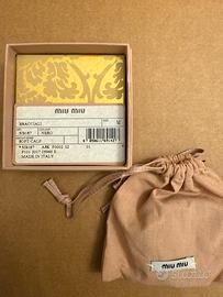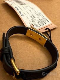 Bracciale MiuMiu nuovo mai indossato con etichetta. Realizzato in pelle con accessori in metallo color oro. Cinturino in metallo sempre in color oro e accessorio cuore con il logo. Il bracciale è lungo centimetri. 22,5 cm
