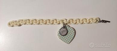 Bracciale Ops in silicone colore crema, con un ciondolo a forma di cuore a pois azzurri. completo della scatola. Bellissimo regalo per San Valentino.