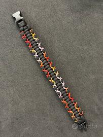 Braccialetto intrecciato in paracord 550, colori nero con intreccio multicolore toni sul rosso.