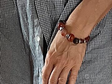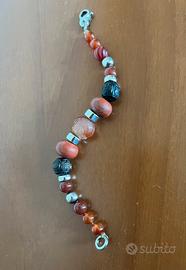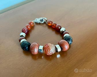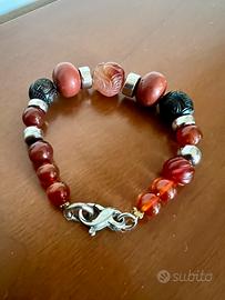 Bracciale eseguito benissimo con perle in pietre dure come ambra, quarzo, onice, infilate con cavetto acciaio, intervallate con elementi in vero argento, come il moschettone e anello di chiusura.