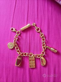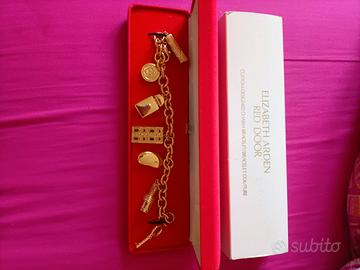 Braccialetto con ciondoliplaccato in oro Elizabeth Arden "Red Door", un articolo promozionale di alta bigiotteria creato per accompagnare il lancio della fragranza iconica. Il braccialetto è stato prodotto in un'edizione limitata, probabilmente tra la fine degli anni '80 e l'inizio degli anni '90, per un breve periodo in cui Elizabeth Arden gestiva una linea di bigiotteria.È realizzato in metallo di base con placcatura in oro di alta qualità (galvanizzato). Presenta una robusta catena a maglie spesse e diversi ciondoli a tema cosmetico, tra cui: