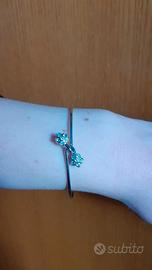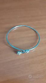 Braccialetto rigido da donna in argento rodiato con chiusura formata da due fiori, decorati con 6 zirconi, che si intrecciano.
