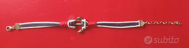 Braccialetto con ancora in acciaio e nodi in stile marinaresco di colore rosso bianco e blu. Lunghezza 23,5 cm