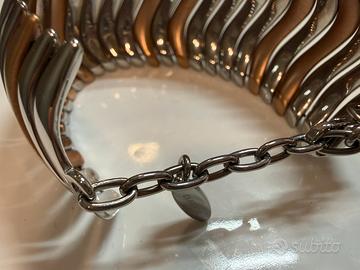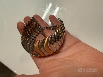 Vendo bellissimo bracciale firmato Stroili Oro, caratterizzato da un design moderno a segmenti curvi. Il bracciale è bicolore (argento e oro/bronzo), perfetto da abbinare con qualsiasi outfit. Materiale: Acciaio inossidabile di alta qualità (non scurisce). Condizioni: Come nuovo, indossato pochissime volte. Chiusura: Moschettone con catenella di regolazione per adattarsi a ogni polso. Presente il logo Stroili. Un pezzo di carattere, elegante e versatile. Disponibile per ritiro a mano o spedizione tramite Subito. #bracciale #braccialetto #stroili #braccialettostroili