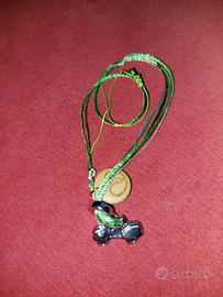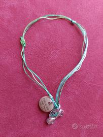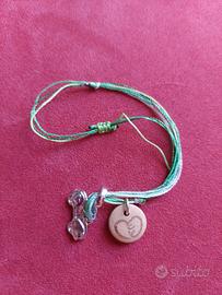 Braccialetto Thun della collezione "Un filo d'amore" per la Fondazione Contessa Lene Thun Onlus. Cordino in fili verdi tono su tono con chiusura a nodino che scorre, per renderlo adattabile a misure di polso sia di adulto che di bambino. 2 ciondoli: uno di legno con cuore inciso e sul retro la scritta della fondazione, l'altro è una macchinina in ottone rodiato. Nuovo e in perfette condizioni, aperto giusto per poterlo fotografare. Completo di scatola e certificato d'autenticità.