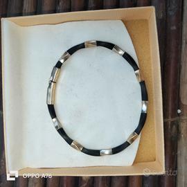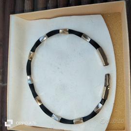 Vendo questo braccialetto unico e dal design moderno, realizzato in caucciù nero con inserti in tre ori: oro bianco, oro giallo e oro rosa. È un gioiello versatile che unisce eleganza e stile contemporaneo, perfetto sia per uomo che per donna.
