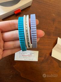 N. 3 bracciali HipHop Jewels nuovi con certificato di autenticità e scatola originale. Il bracciale azzurro ha un piccolo difetto ad uno dei due estremi della chiusura, ma essendo rimovibili e intercambiabili si può usare una delle chiusure bianche o lilla. Inclusa una stringa di brillantini Swarovski applicabile a qualsiasi dei tre bracciali.