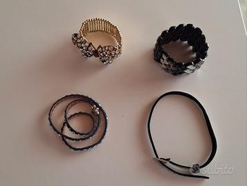 Quattro bracciali più orecchini. Due bracciali sono con elastico. Il bracciale blu con calamita e il bracciale nero con cinturino.