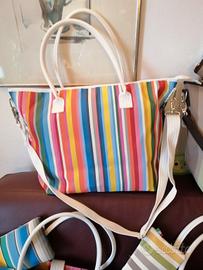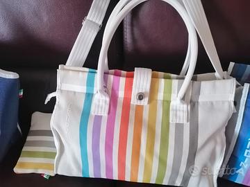 bellissime e coloratissime queste borse per spiaggia brandina, molto capiente per contenere comodamente teli da spiaggia e altro. Alcune hanno la tracolla e la pochette abbinata.Misura grande, multicolor €. 70