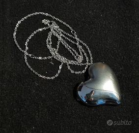 Luminosa collana in acciaio con pendente a cuore, arricchito dai cristalli bianchi e dal contrasto lucido/opaco, in buone condizioni.