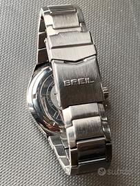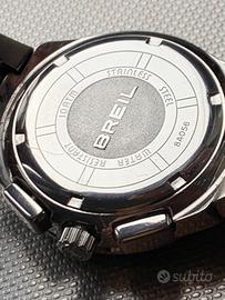 Rarissimo cronografo subacqueo 10 ATM BREIL MANTA Chronograph 100M referenza 8A056 con movimento al quarzo - condizioni eccellenti (normali segni di utilizzo) - funzionamento perfetto - sottoposto a revisione nel mese di febbraio 2026 - cassa di 40mm di diametro - quadrante nero con indici e lancette luminescenti e piccoli contatori cronografici tono su tono - quadrante contornato da una particolare cornice in acciaio a forma geometrica di dodecagono - ghiera argento con scala tachimetrica - corona con logo - cristallo minerale - stupendo bracciale inox originale incorporato alla cassa ad andamento decrescente completo di tutte le maglie con la scritta Breil sulla chiusura - adatto a polsi di qualsiasi misura