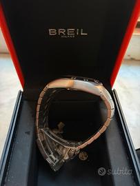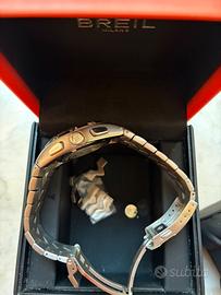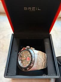 Breil Milano - Collezione Ducati Corse Chronograph Questo cronografo rappresenta l'incontro perfetto tra l'eccellenza dell'orologeria italiana di Breil e l'anima sportiva e ruggente di Ducati. Un pezzo dinamico, pensato per chi ama la velocità e la precisione tecnica. Caratteristiche Principali • Design del Quadrante: Il quadrante nero è arricchito dall'iconico scudetto Ducati Corse a ore 6. Gli indici numerici chiari e le lancette con inserti gialli garantiscono una leggibilità immediata, richiamando la strumentazione delle superbike. • Funzioni Cronografiche: Dotato di tre sotto-quadranti per la misurazione dei tempi parziali e finestrella del datario posizionata tra le ore 4 e le ore 5. • Lunetta Bicolore: La ghiera fissa presenta un raffinato gioco cromatico: una sezione rossa Ducati (da 0 a 15 minuti) che sfuma nel nero antracite, con scala numerica per il monitoraggio dei tempi. • Materiali e Finiture: Cassa robusta in acciaio inossidabile satinato con bracciale integrato a maglie larghe, che assicura una presenza importante e sportiva al polso. • Packaging Originale: L'orologio è presentato nella sua custodia originale Breil Milano, caratterizzata dal contrasto nero e arancio, perfetta per la conservazione o per un regalo di classe.