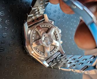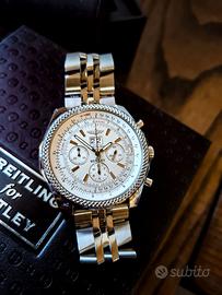 OROLOGIO FULLSET CON SCATOLA E CARD BREITLING Breitling Bentley Motors 6.75 Speed Sport 'Silver Storm' in acciaio inossidabile edizione speciale, quadrante bianco argentato con grande data a ore 12. Dotato di una lunetta girevole zigrinata bidirezionale che controlla il "regolo calcolatore" noto anche come "computer di navigazione". La complicazione del regolo calcolatore può calcolare diversi calcoli aerei come il consumo di carburante, i tempi di salita e la conversione delle miglia in miglia nautiche o chilometri. Il fondello decorato in modo speciale è stato stampato/goffrato con la forma e il contorno distinti di un bordo Bentley. Calibro Breitling 44B A44362, batte a 28.800 VPH, contiene 38 gioielli e ha una riserva di carica di circa 42 ore. Bracciale Speed in acciaio inossidabile con fibbia pieghevole pieghevole. 48 mm ROBA DA CAMPIONE Breitling e Bentley si sono entrambi fatti un nome nella produzione delle macchine meccaniche più prestigiose e performanti del pianeta. Con la serie di orologi Breitling Bentley, le due aziende onorano quella tradizione di eccellenza offrendo orologi di qualità superiore e, in definitiva, eleganti. Questa affascinante collezione è fatta per gli uomini, pensando soprattutto agli automobilisti. UN'ARTE DI VIVERE Chic britannico, eccellenza svizzera: la collezione Breitling for Bentley ha affermato una nuova arte di vivere. Simboleggiato dalla B alata, traccia il proprio percorso, riflettendo un universo esclusivo in cui convergono lusso e realizzazione. Prestazioni e prestigio. Potenza e stile. Classe e audacia. Nata dall'incontro tra la grande arte automobilistica britannica e la grande tradizione orologiera svizzera, questa ricca famiglia di cronografi esclusivi ospita "motori" eccezionali all'interno della sua carrozzeria in oro, acciaio o titanio. Progettato ad arte e prodotto con estrema attenzione ai dettagli, incarna lo stesso slancio nella ricerca della perfezione e della bellezza condiviso dalla famosa casa aut