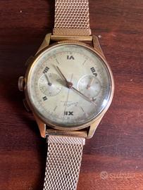 BREITLING CADETTE CRONOGRAFO CAL. VENUS 188. 38mm 18K CASE. VINTAGE 1940’s. L’orologio di p presenta in buone condizioni generali ,funzionante presenta una piccola forzatura sul lato destro come si vede in foto per qualsiasi cosa non esitate a contattarmi si accettano offerte non ridicole