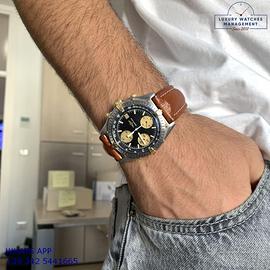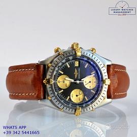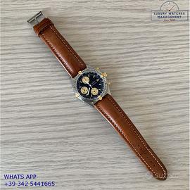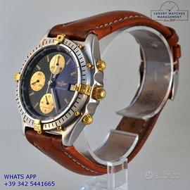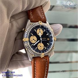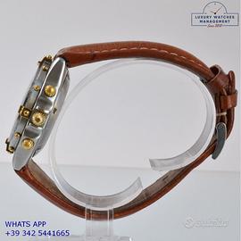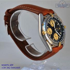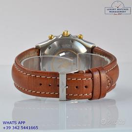 Breitling Chronomat cronografo acciaio, anno di produzione 1989, ghiera unidirezionale acciaio con cavalieri dorati, vetro zaffiro antiriflesso, quadrante colore nero con data a tre contatori verticali, indici e sfere al trizio, movimento meccanico a carica automatica, cinturino in pelle di vitello colore marrone con fibbia acciaio originale Breitling.