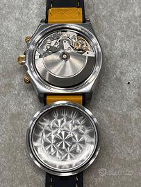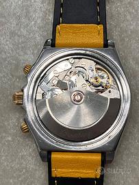 Vendo cronografo automatico Breitling Chronomat anni ’90 in acciaio e oro, modello iconico con lunetta con rider tabs. Caratteristiche principali: Movimento automatico cronografo (tipo Valjoux 7750) Datario Cassa bicolore acciaio/oro Pulsanti e corona a vite Quadrante blu con contatori cronografici Cinturino aftermarket in pelle/gomma Condizioni: Buone condizioni generali Normali segni di utilizzo su cassa e lunetta Quadrante con patina/ossidazione visibile (vedi foto) Meccanica revisionata Dotazione: Solo orologio, no scatola e documenti