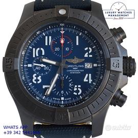 Breitling Super Avenger 48 Night Mission cronografo in titanio con trattamento DLC colore nero, anno di produzione 2020, ghiera unidirezionale titanio DLC colore nero a scala graduata, vetro bombato zaffiro antiriflesso, quadrante colore blue con data a tre contatori verticali indici e sfere al Chromalight, movimento meccanico a carica automatica, cinturino coordinato in tesutto e pelle con fibbia in titanio DLC colore nero originale Breitling.