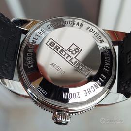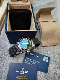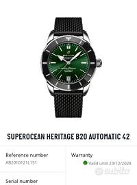 Breitling Super Ocean Heritage II 42mm Ref. AB2010121L1S1 Quadrante Verde. Calibro Breitling B20 (Manifattura) meccanico, carica automatica. Riserva di carica 70 ore - 28 800 a/h - 26 rubini. Cassa acciaio inossidabile. Resistenza all'acqua 20 bars (200 m/660 ft). Lunetta girevole in ceramica. Corona a vite, due guarnizioni. Cristallo zaffiro bombato, antiriflesso su entrambi i lati Peso 139 g. Peso della testa dell'orologio 91 g. Diametro 42 mm. Spessore 14.35 mm. Larghezza dell'ansa 22 mm. Cinturino Caucciù nero 22/20 mm con Fibbia 20 mm acciaio inossidabile. Tagliato per regolazione su polso da 18 cm di diametro (è possibile accorciarlo ulteriormente) con possibilità di regolazione rapida da fibbia di un altro cm in estensione. Orologio acquistato il 23.13.2023 Garanzia valida fino al 23.12.2028 Listino 5.400 Euro Scambio a mano a Carrara, Massa, Versilia, La Spezia e zone limitrofe.